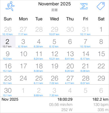 やっとチョイ肌寒いランニング向きの季節になりましたね。といっても、モリモリ走れてはいませんが。先月(11月)の月間走行距離は10月とどっこいどっこい。182.2km (10月は175.9km)まぁ、こんなものでしょうか(苦笑)今シーズン1回...