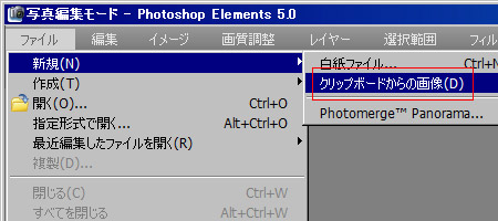 Photoshop Elements のメニューバー [ファイル] → [新規] → [クリップボードからの画像] を選択しクリック