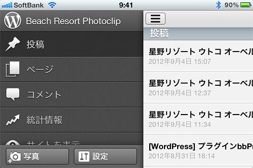 必要な情報を入力するだけで、間違いがなければ一番上のスクリーンキャプチャのような画面が表示されて、投稿一覧 (& 新規投稿) やページ、コメント、数タップで写真が投稿できるボタンなどが表示されます。