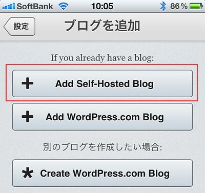 赤枠 [+Add Self-Hosted Blog] をタップして