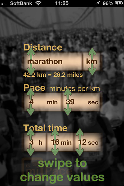 一段目の Distance で距離を設定したあとは、二段目の Pace と 三段目の Total time のところにあるカウンターをスワイプするだけ。