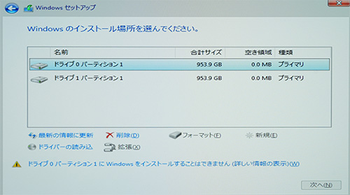 Windowsをインストールする場所を選択するのですが、最初なぜか領域が2つに分かれてしまっていて「インストールできません」の表示が出ます。