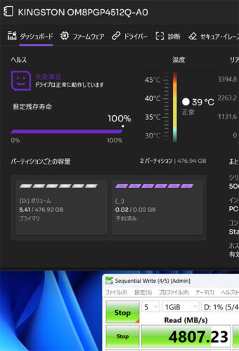Kingston の M.2 ですが CrystalDiskMark 計測中の最高温度は39度でした。