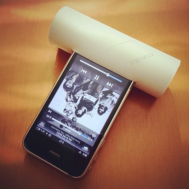 ラップの芯でiPhoneのスピーカーを作ってみた。タダのわりにはイイぞ(笑)真ん中の小さな穴はホームボタンをつまようじ押すため(^^;